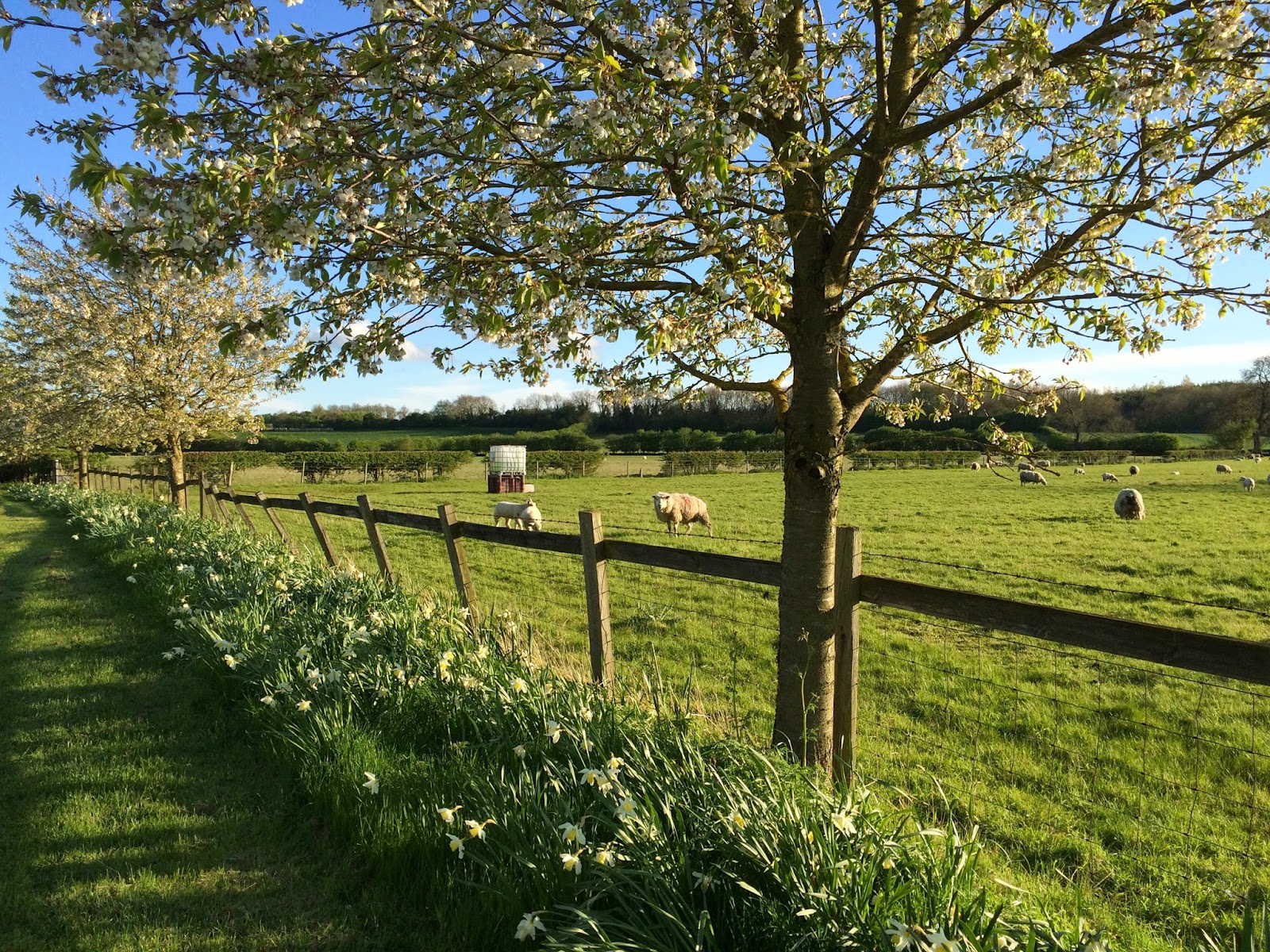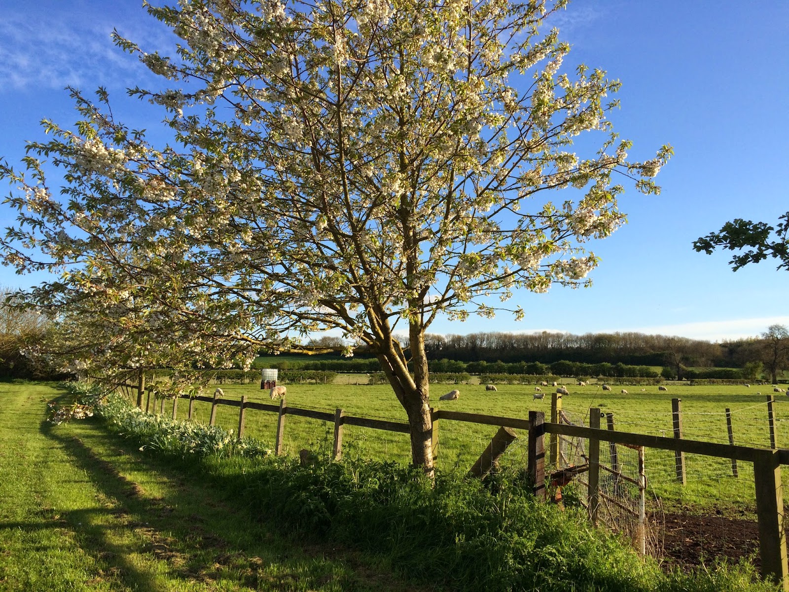 It was a different landscape here. The sun had come out and there were meadows of grazing sheep, blossom trees, pastoral English village loveliness. We had to do a bit of a detour as there was a sign about a bull and calves in a field, alternative routes and danger, and Poppy wasn’t taking any risks.