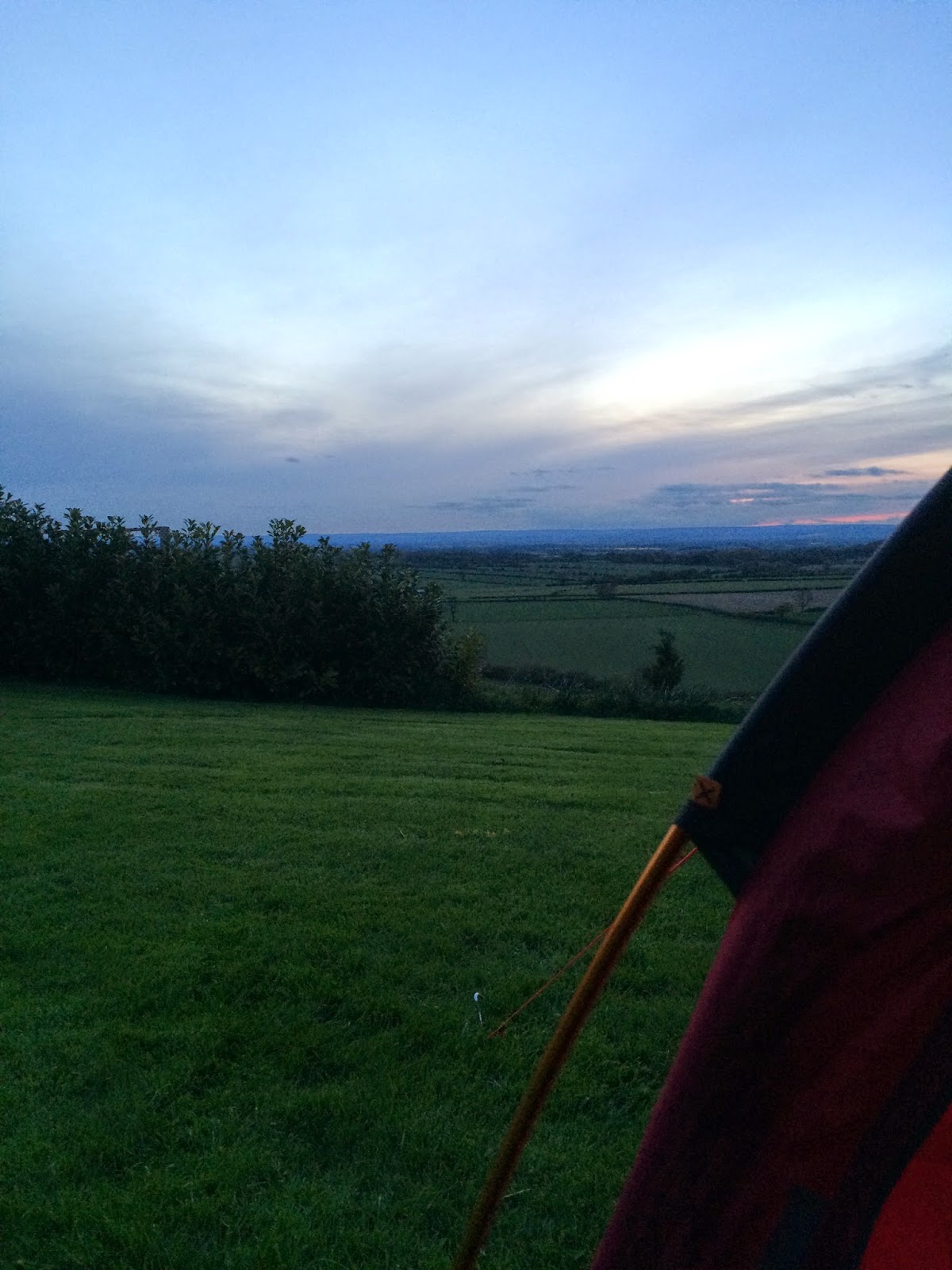 We arrived at the farm at 8.15pm. There were old Volvos in the farmyard, a few caravans at the back, but no sign of any tents, and we couldn’t get an answer at the farmhouse, so we pitched our tent on a likely bit of grass with a splendid view, next to a barn full of cows and sheep. Subsequently we found we were in the wrong place. We should have camped in the orchard on the other side of the farm where the toilet block was. The farmer and his wife didn’t mind though. They said we could use the bathroom in their house.