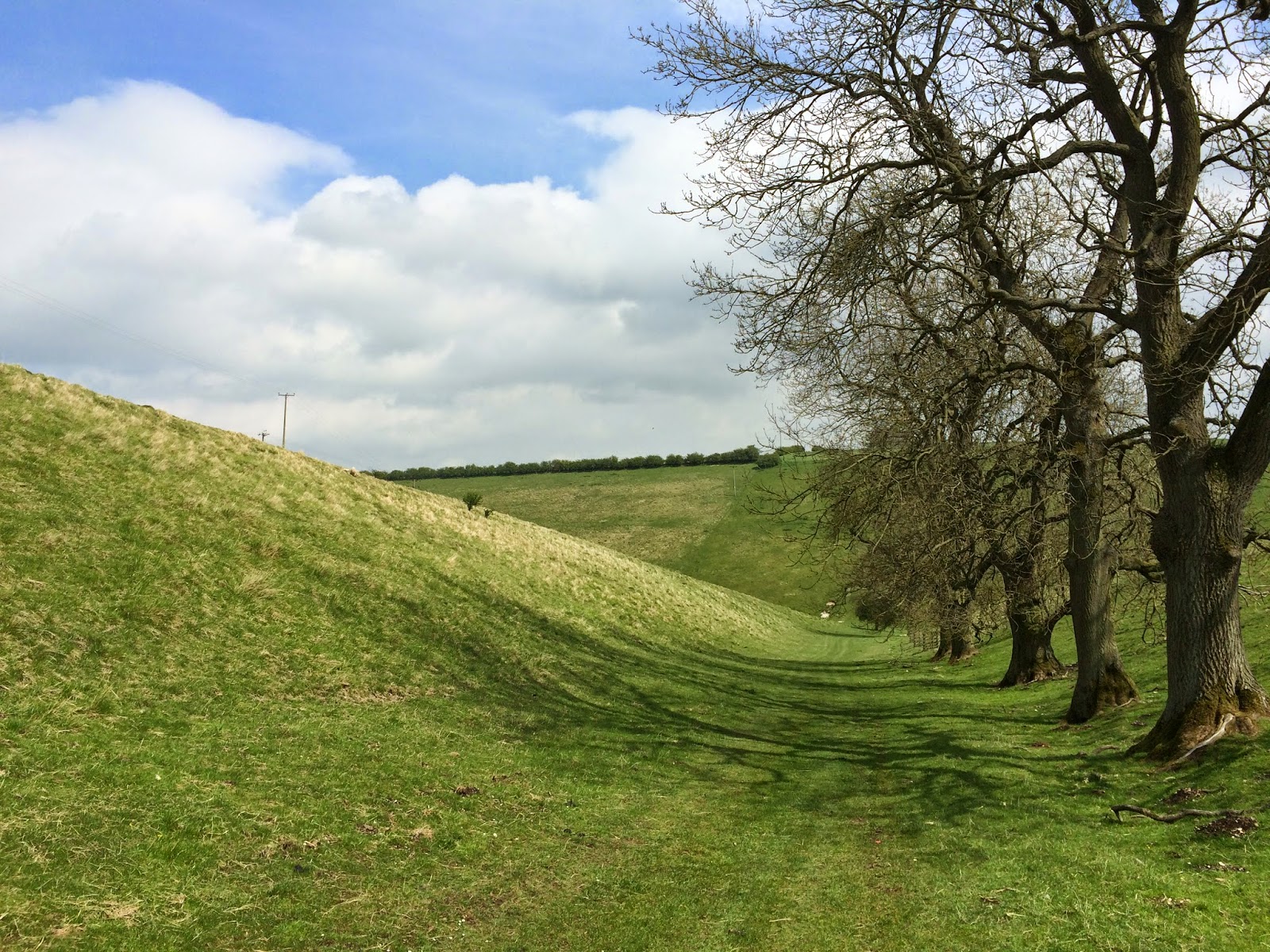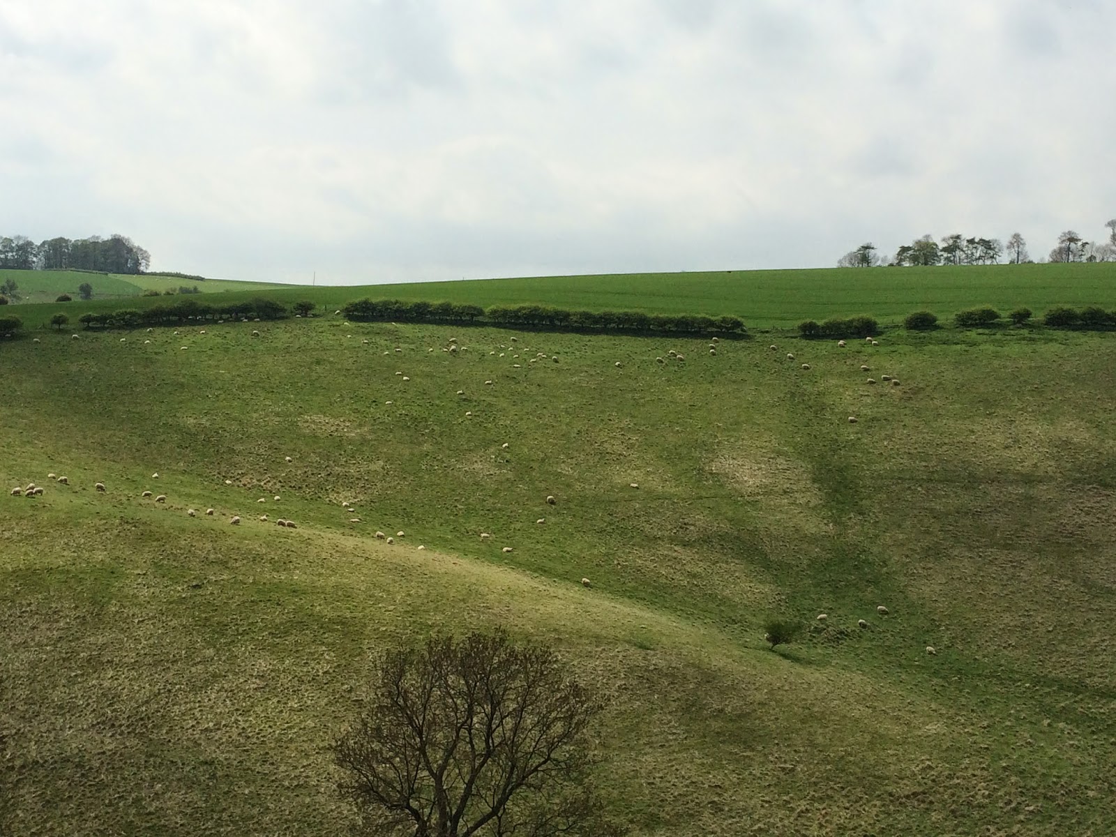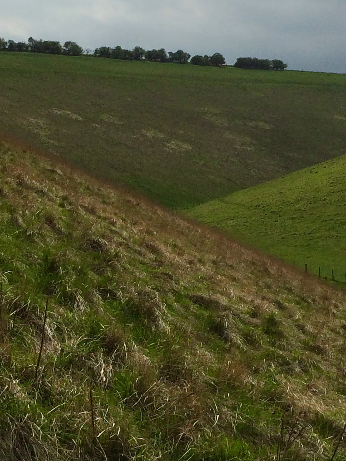 The landscape continued to remind us of Hockney, which isn’t really surprising as this is his stomping ground. Yesterday, except for the odd moment, it wasn’t that inspiring. There are only so many field edges you can walk before you feel that you’ve really done field edges. Today was different. Today we felt like we were in the Yorkshire Wolds and that we’d never been anywhere like it before. According to Wikipedia, a wold is a wooded area on high ground. There wasn’t a lot of woodland in evidence, patches here and there maybe. What was striking was not so much the hilltops as the valleys – green flat bottomed Vs, dotted with sheep, streaked with chalk and yellow rape fields, topped with huge skies. There was a lot of up and down, but it was definitely worth it.