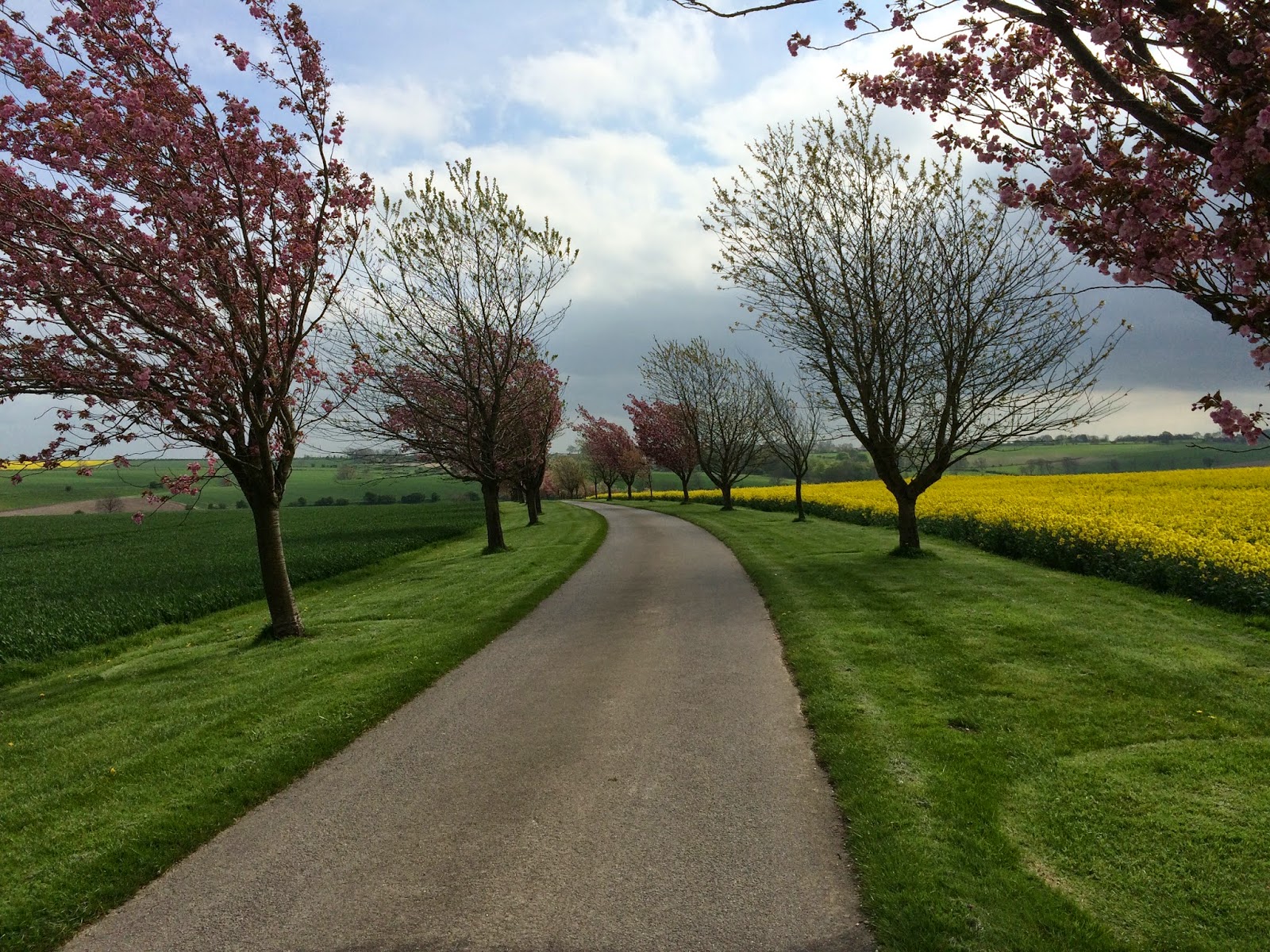 The lane into Huggate, our planned lunch stop, was amazing. Mown verges, an avenue of cherry trees in blossom against the yellow rape and the grey sky. Never mind Hockney, I felt like getting out my own paint brush and I don’t even have one. It was a bit posh though. I mean, just a country lane – why was someone coming out with the mower? Then we realised it was not just a lane, but the driveway to Northfield House.