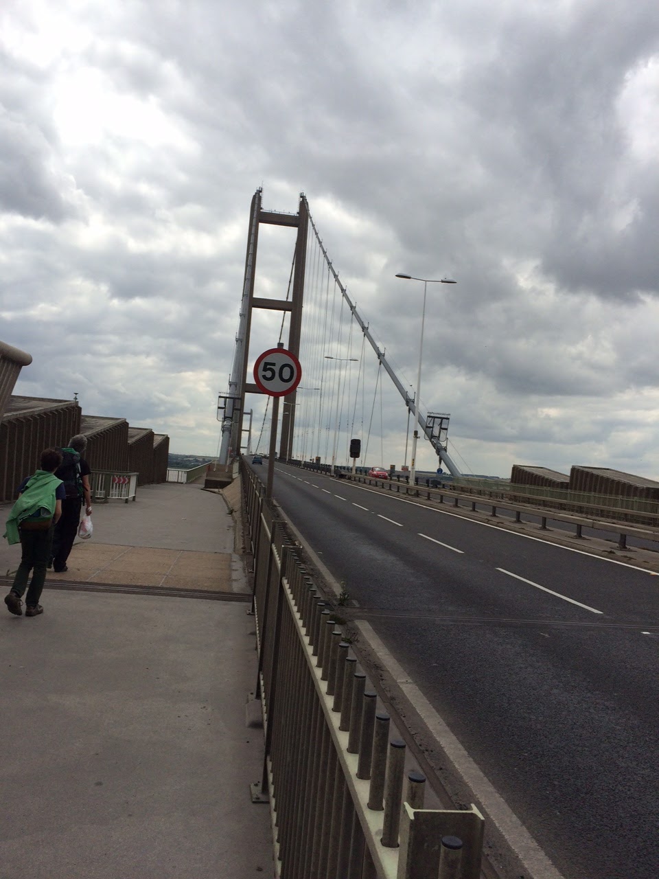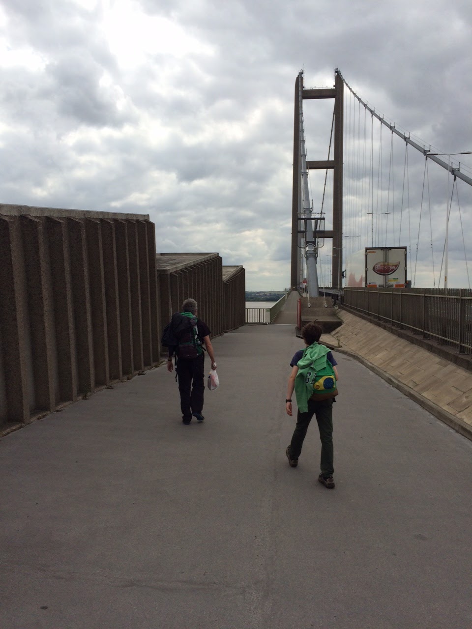 So we got the train from Hebden Bridge to Hessle and began by walking across the Humber Bridge. I was nervous before we left home and I was even more nervous when we walked onto it.. This is a huge mother of a bridge. It used to be the longest suspension bridge in the world, and although a number of bridges, mostly in China, have now overtaken it, it’s still in the world’s top ten. You walk and you walk and you feel like you aren’t getting anywhere. I kind of wanted someone to reassure me with facts and figures – how safe it was, how rigorously it is maintained, how there’s a record of no one coming to harm, particularly pedestrians. Johnny pointed out the little holes every few yards. If you looked through them you could see the water below. I’d been trying to ignore them.